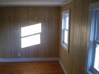 After my crazy week, we decided to take advantage of the fact that my waterbed didn't need to be emptied to move upstairs to a bigger and brighter room. After the contractors left, I had 5 nice new windows and some paneling-I am NOT a wallpaper person and can't stand the peeling wallpaper I have in some spots in the house, so while pretty as it looks I prefer painted sheet rock with designs or paneling. The paneling in the hallway is so dark and dreary, I opted for a more natural wood color.